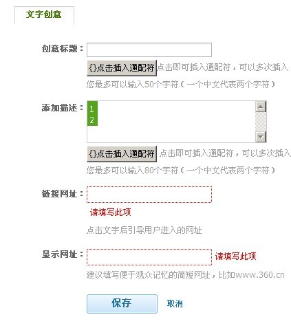 從上圖可以看出360點(diǎn)睛的創(chuàng )意添加編輯形式和百度鳳巢基本相同